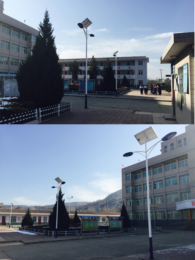 簡介—— 甘肅省平涼市學校路燈工程,采購的是我蘭光照明單板雙頭太陽能路燈,甘肅的冬季天黑的比較早,為了給校園操場提供照明路燈,安裝節能型的太陽能路燈,在學校的操場和道路上安裝,給同學們提供夜間照明。